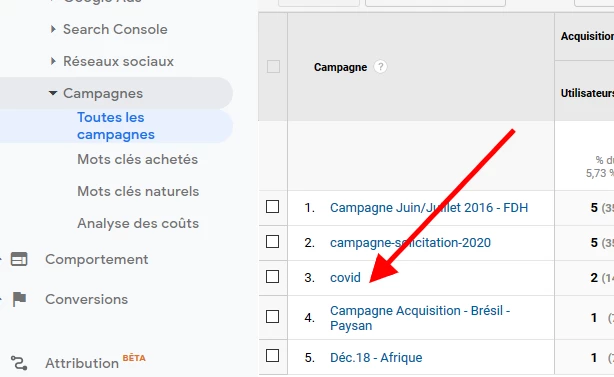 Vous obtenez le listing de toutes les campagnes, on voit bien notre campagne "covid".