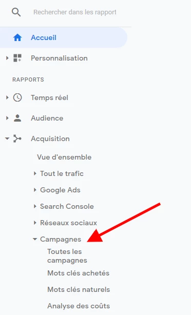 Ouvrir le panel Rapports > Acquisition > Campagne