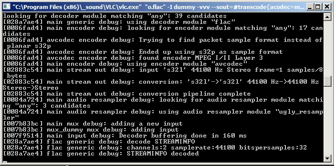 for %a in (*.flac) do "C:\Program Files (x86)\VideoLAN\VLC\vlc.exe" "%a" -I dummy -vvv --sout=#transcode{acodec=mp3,ab=192}:std{access=file,mux=raw,dst="%a.mp3"} vlc://quit