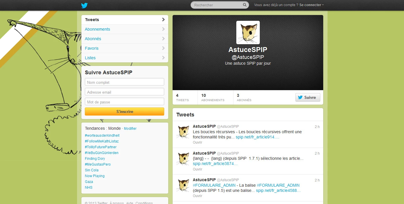 Le robot reprend un article au hasard du site http://www.spip.net pour le publier sur twitter